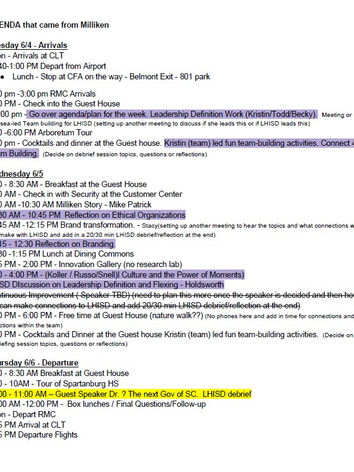According to the travel forms, not all participants seemed clear on the purpose of the visit. The agenda suggests the trip was still being organized on-site, with most time spent in LHISD-led sessions, breaks, and cocktail hours. Maybe 6 hours were scheduled with Milliken & Company staff?